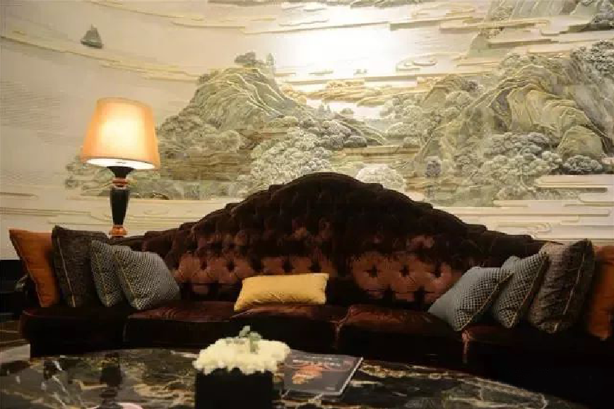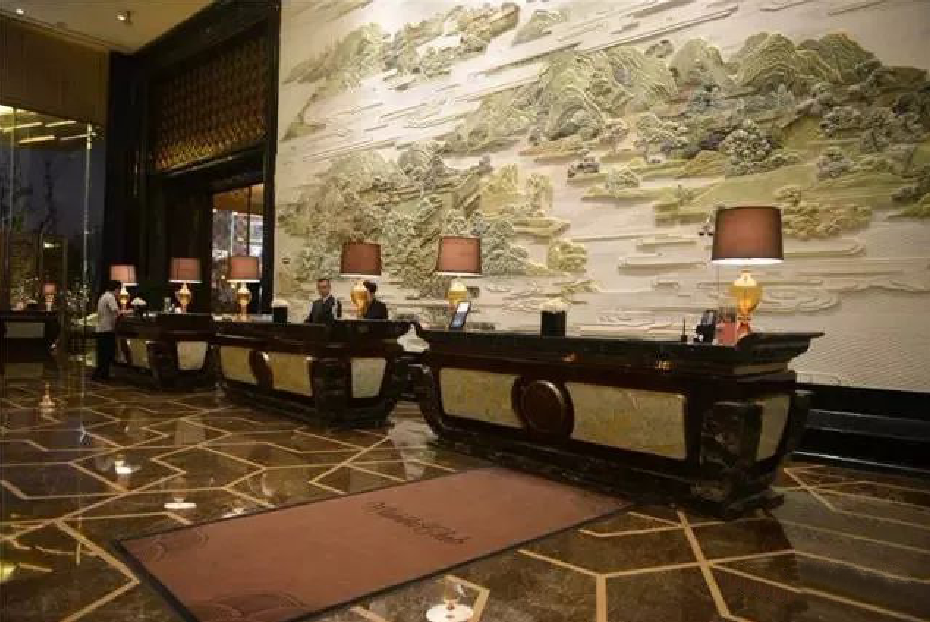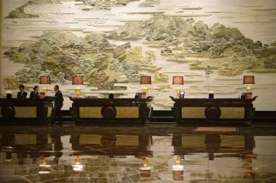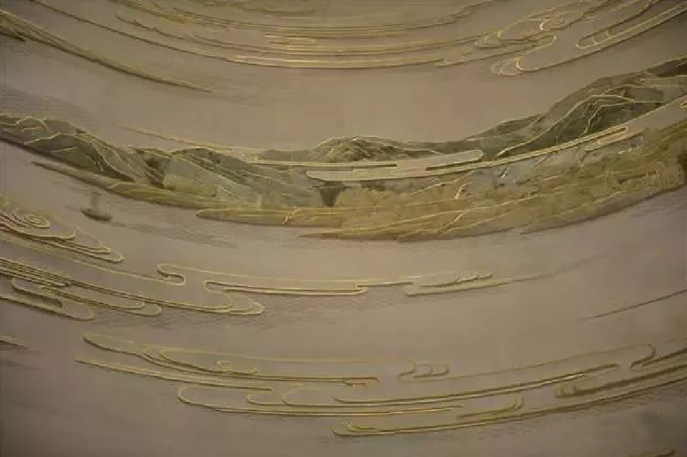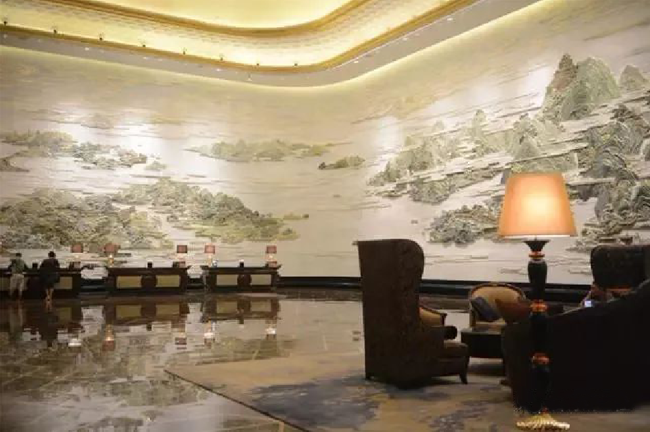 把大堂設計成一幅立體的環(huán)繞式大型山水壁畫(huà)